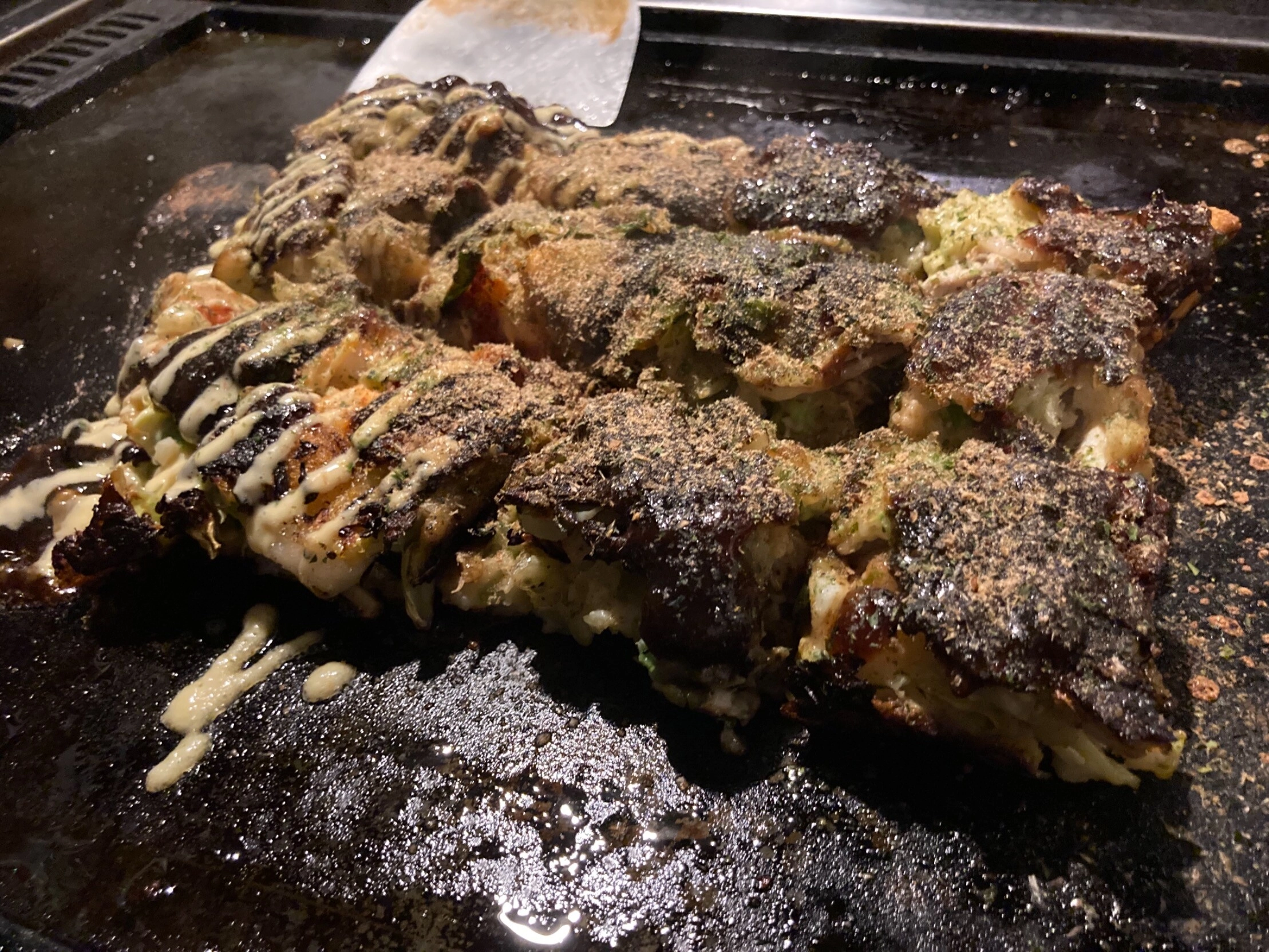 私これでも大阪人なので数え切れないほどお好み焼きは食べてきましたが,四角く料理されるのは始めて目にしましたね。六甲山のお好み焼きを,最初お好み焼きだと認識できなかったくらいには。