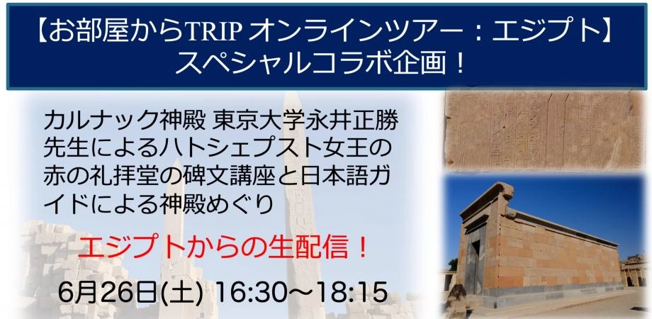 観ています >>【お部屋からTRIP オンラインツアー:エジプト】 スペシャルコラボ企画! カルナック神殿 東京大学 永井正勝 先生によるハトシェプスト女王の赤の礼拝堂の碑文講座 と 日本語ガイドによる神殿めぐり 生配信! | Peatix https://peatix.com/event/1941675?lang=ja