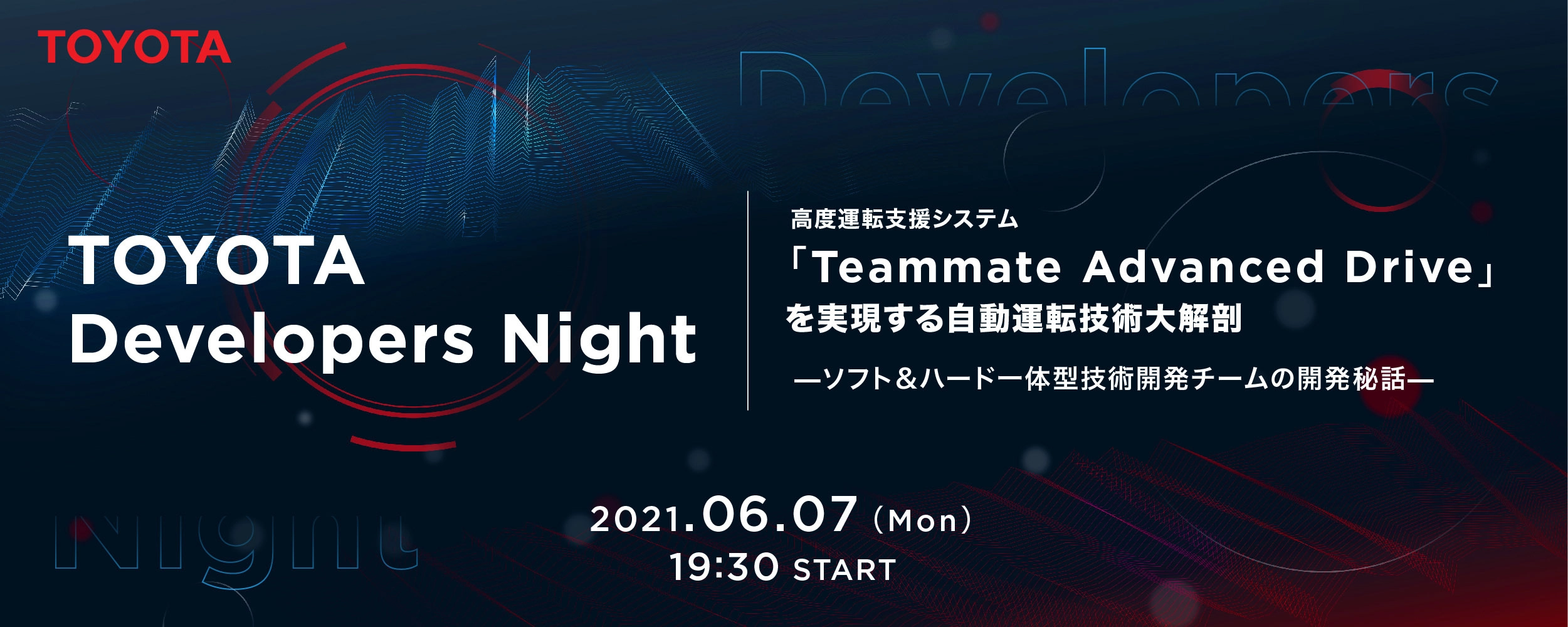 TOYOTA Developers Night 高度運転支援システム「Teammate Advanced Drive」を実現する自動運転技術大解剖 ーソフト&ハード一体型技術開発チームの開発秘話ー|IT勉強会ならTECH PLAY[テックプレイ] https://techplay.jp/event/816108?utm_source=event_join_save&utm_medium=social&utm_campaign=feed&utm_content=tw585291212&tp=1