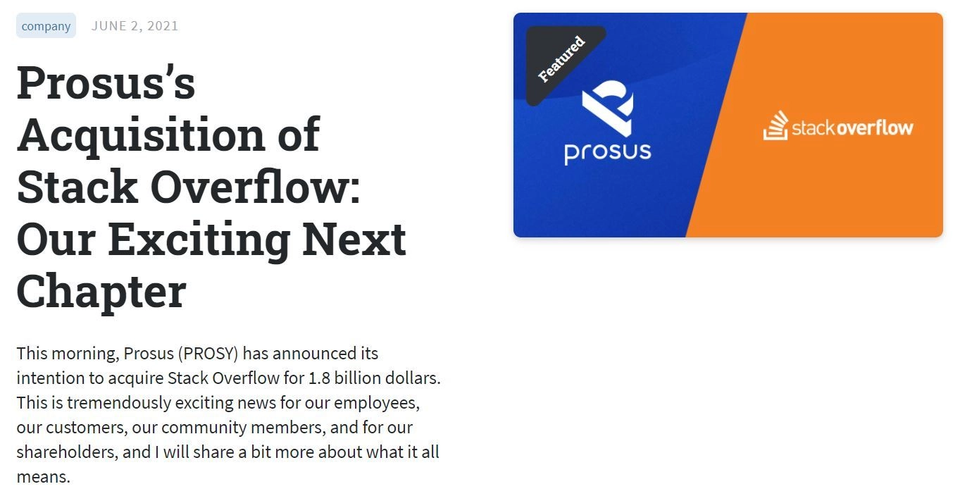 プログラマー向けQ&Aサイト「Stack Overflow」をProsusが18億ドルで買収 - ITmedia NEWS https://www.itmedia.co.jp/news/articles/2106/03/news072.html
