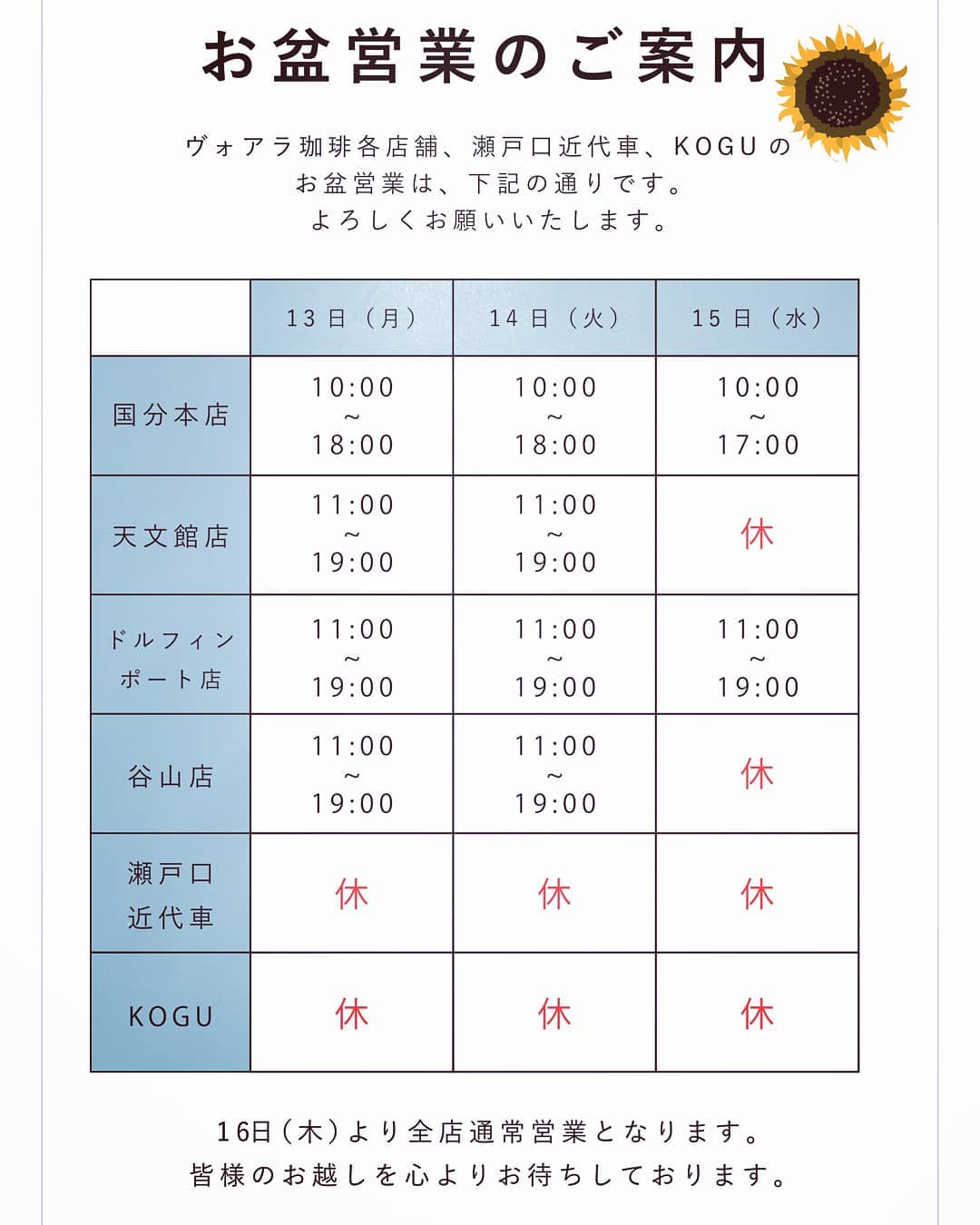 "KOGU鹿児島さんはInstagramを利用しています:「. お盆営業のご案内ですm(_ _)m お客様にはご迷惑をお掛けしますが、よろしくお願いいたしますm(_ _)m . 期間中は夏季休暇により出荷物流の止まるメーカーもございます。 納期が遅れる場合がございますがご了承くださいませm(_ _)m」" https://www.instagram.com/p/BmPvXPkhdD2/In conversation from gnusocial.matoken.org permalink Attachments