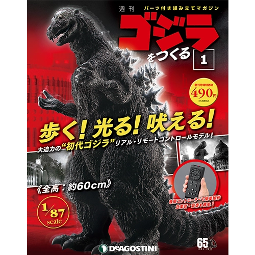 日本が誇る偉大なキャラクター「ゴジラ」。1954(昭和29)年の記念すべき映画「ゴジラ」の封切りから65年、ゴジラ映画は30作以上を数え、2019年には新たなハリウッド版ゴジラの公開があり、国と世代を超えてその人気は広がり続けている。週刊『ゴジラをつくる』では、それらすべてのゴジラの原点である「初代ゴジラ」のビッグスケール・リモートコントロールモデルを、毎号付属するパーツを使って組み立てていく。1/87スケール=全高約60cmの大型モデルは、自らの力で歩き、吠え、背ビレが発光する!さあ、これまでになかった大型リアル・ゴジラをあなたの手で体感しよう!!